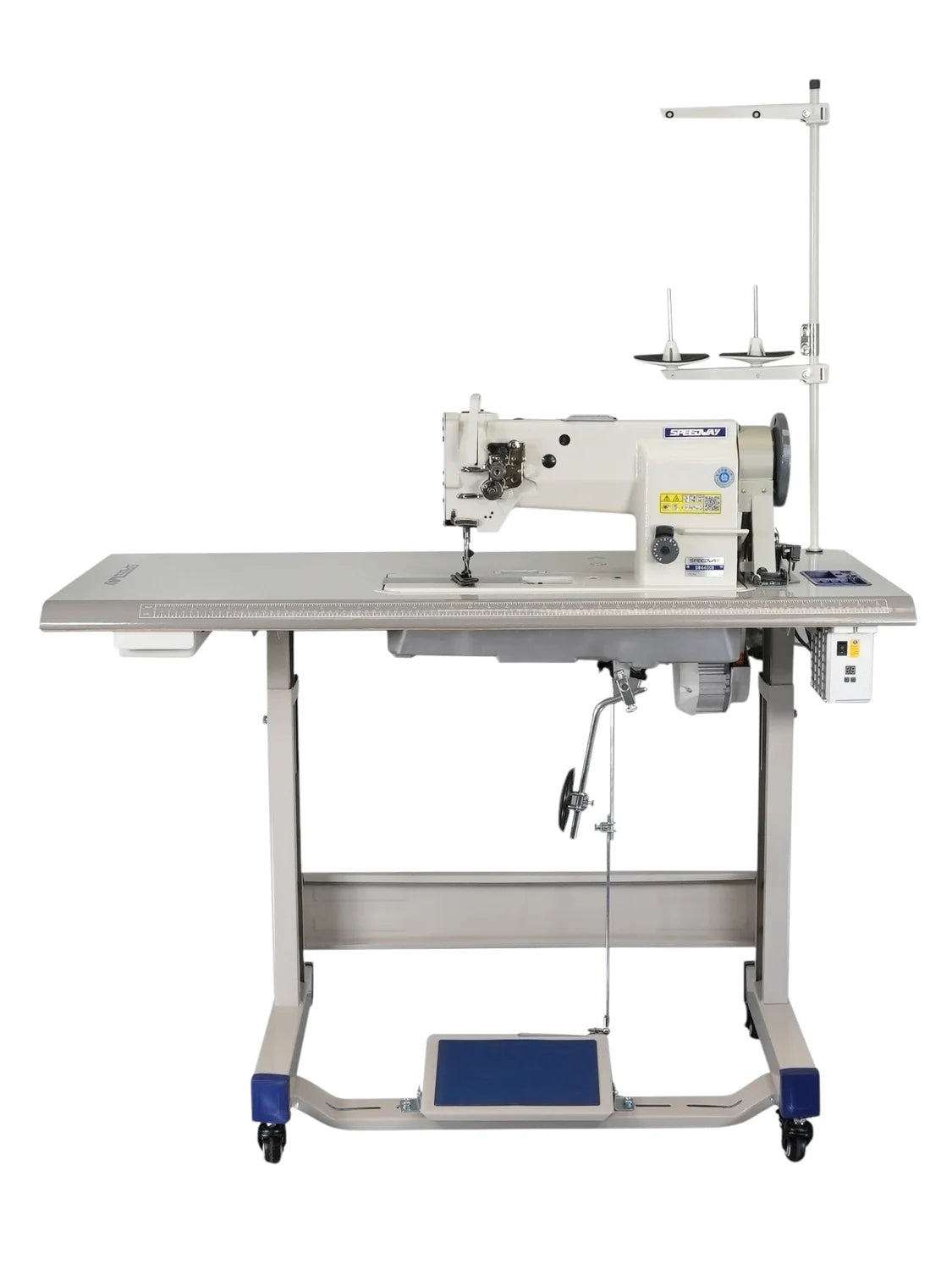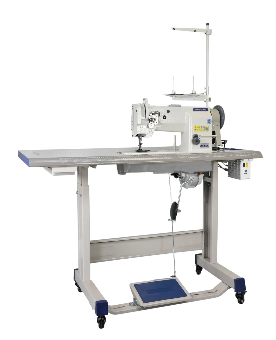 The SPEEDWAY SW-4400N is a professional-grade heavy-duty machine designed for demanding industrial applications. Its unison feed system, large hook capacity, and built-in safety clutch provide stable, precise performance for sewing thick materials under high tension. Supplied fully assembled with a servo motor, table, and stand.