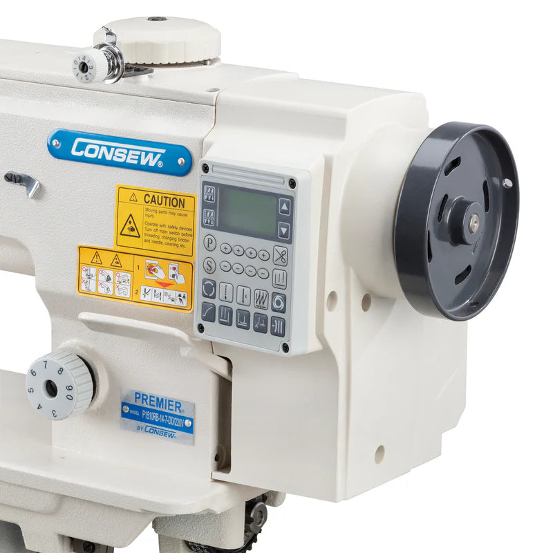 The Consew P1510RB-14-7DD/220 is a heavy-duty, single-needle walking foot lockstitch machine engineered for automotive, marine, leather, canvas, and general upholstery applications. With a direct-drive servo motor on the top shaft, automatic thread trimming (-7DD), auto reverse, and automatic presser-foot lift, it delivers smooth feeding, clean finishes, and consistent industrial performance on light to heavy materials.